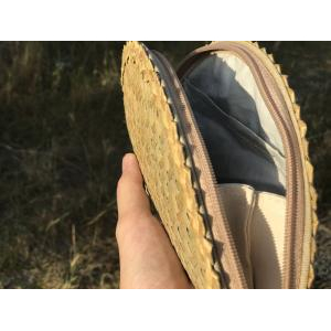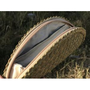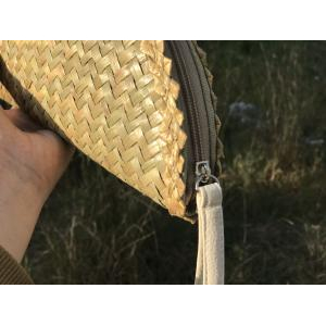 - Lớp ngoài được đan bằng cỏ bàng, với các đường đan tinh tế, tạo nên bộ khung của ví. Lớp viền bằng vải bên ngoài có thể tạo nên cảm giác mềm mại để người dùng để cầm nắm