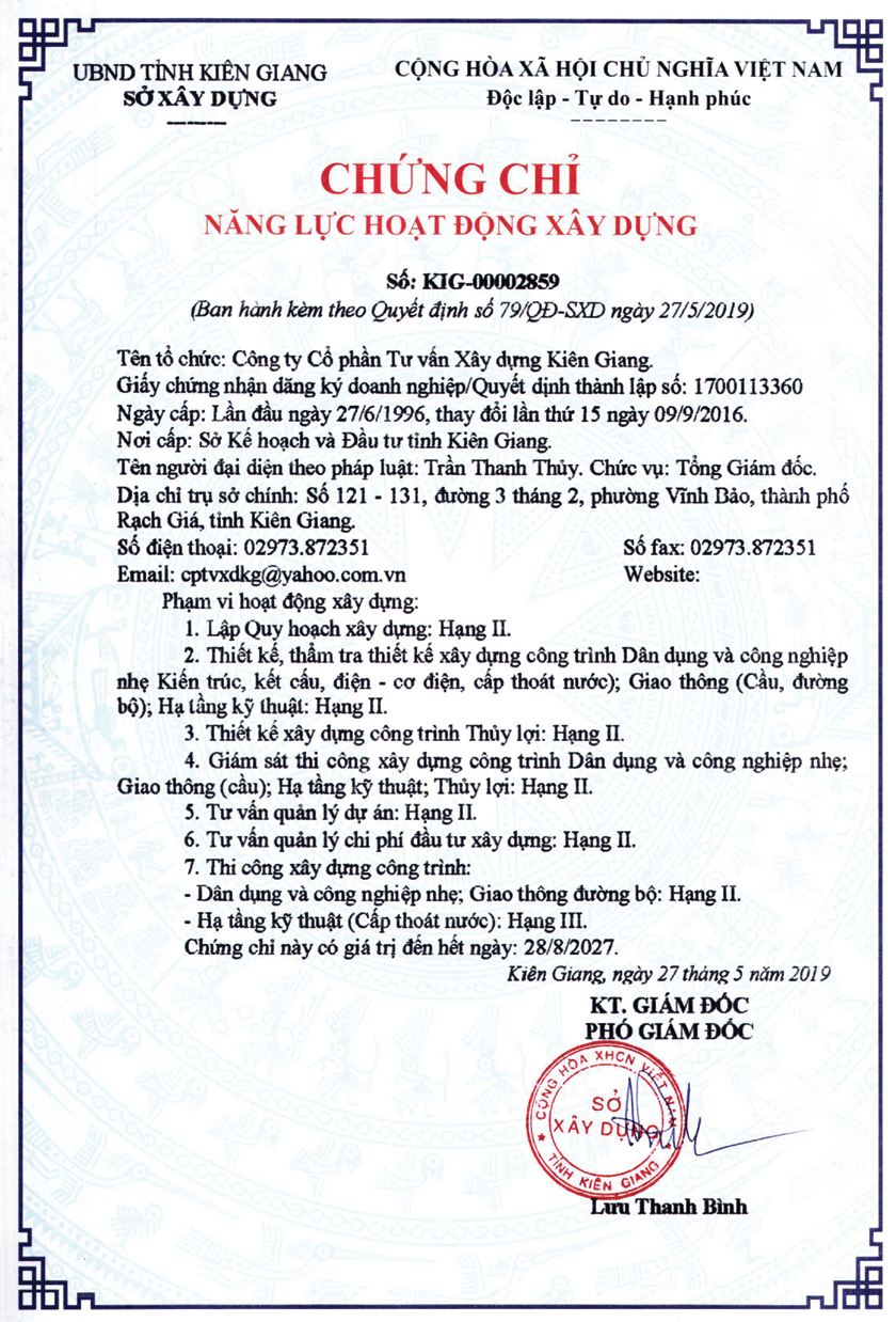 Ngày 15/6/1996 Chủ tịch UBND tỉnh ký Giấy phép thành lập công ty cổ phần số 003347 GP/TLDN-03 với các nội dung: Tên công ty: CÔNG TY CỔ PHẦN TƯ VẤN XÂY DỰNG KIÊN GIANG - Trụ sở: số 19C, Minh Mạng, phường Vĩnh Thanh Vân, thị xã Rạch Giá, tỉnh Kiên Giang - Ngành nghề kinh doanh: Lập báo cáo tiền khả thi và khả thi; Khảo sát, quy hoạch, thiết kế; tư vấn thẩm định; lập và đánh giá hồ sơ dự thầu; giám sát kỹ thuật; kiểm định chất lượng; quản lý dự án; thi công thử nghiệm và trang trí nội thất các công trình đặc biệt được UBND tỉnh cho phép – Vốn điều lệ: 500.000.000đ (năm trăm triệu đồng) – Thời gian hoạt động: 30 năm.