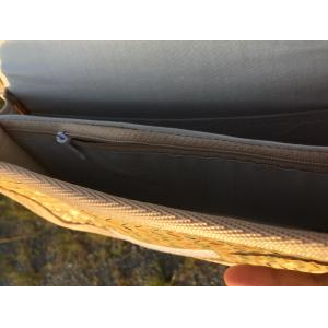- Lớp ngoài được đan bằng cỏ bàng, với các đường đan tinh tế, tạo nên bộ khung của ví. Lớp viền bằng vải bên ngoài có thể tạo nên cảm giác mềm mại để người dùng để cầm nắm