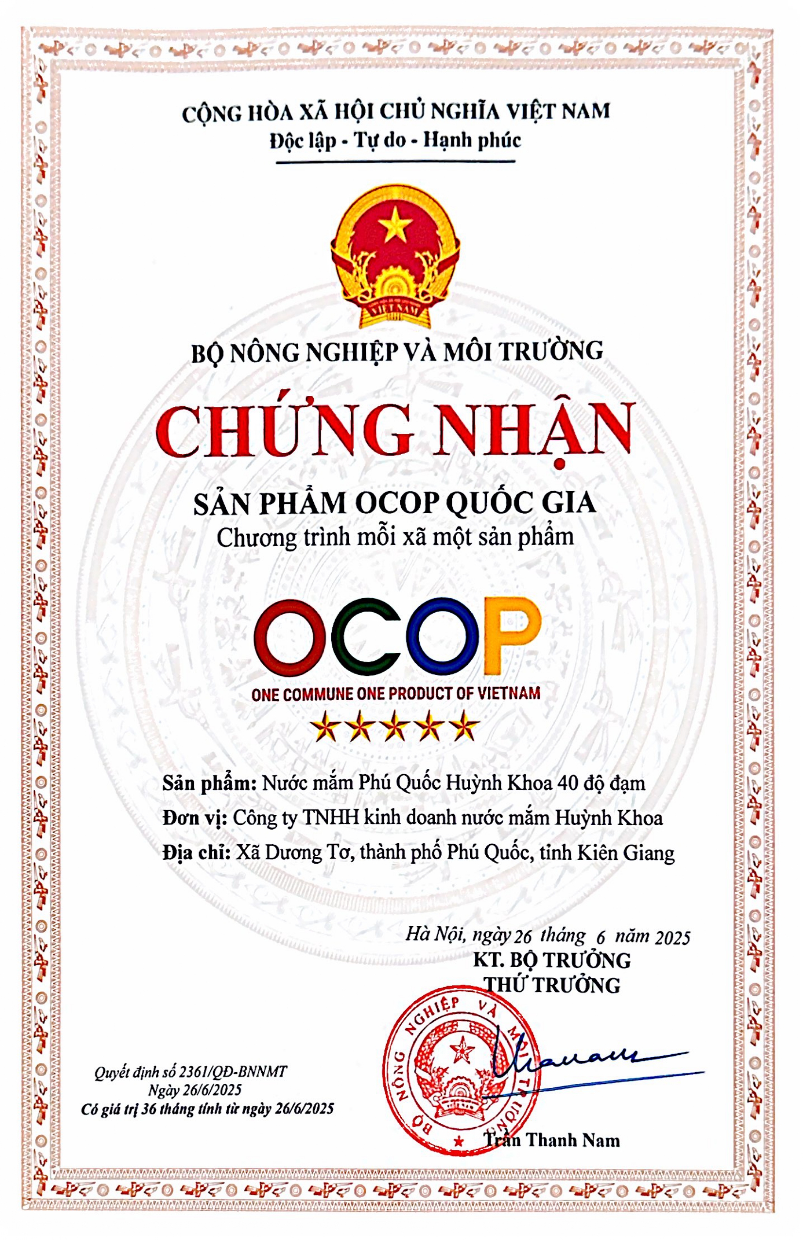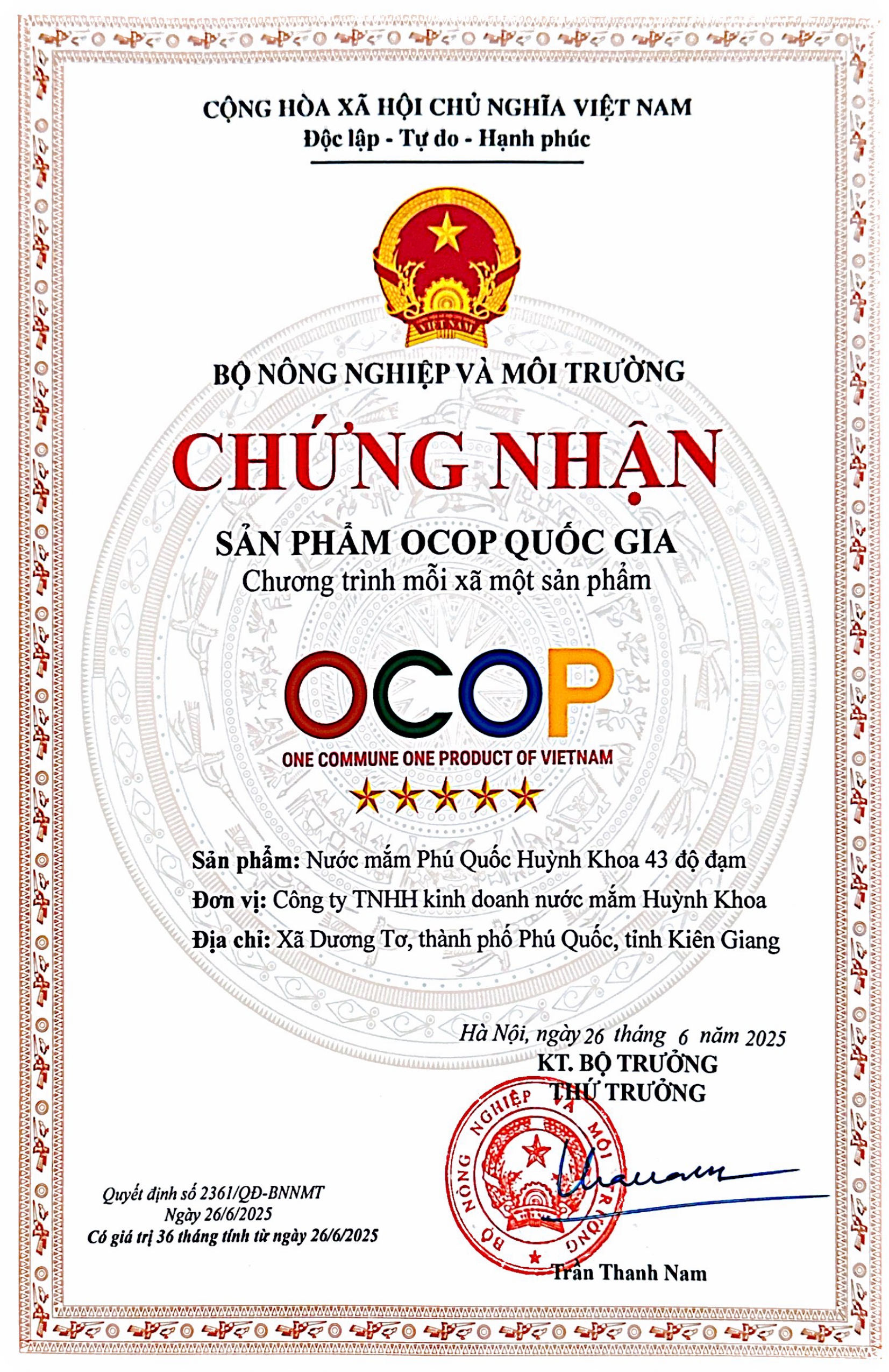 Với hơn 40 năm bền bỉ gìn giữ và phát triển hương vị nước mắm truyền thống, tập thể Nhà thùng Nước mắm Truyền thống Huỳnh Khoa Phú Quốc chính thức đón nhận Chứng nhận OCOP 5 sao cấp quốc gia cho các dòng sản phẩm nước mắm độ đạm cao: 40 – 43 – 45 độ đạm.