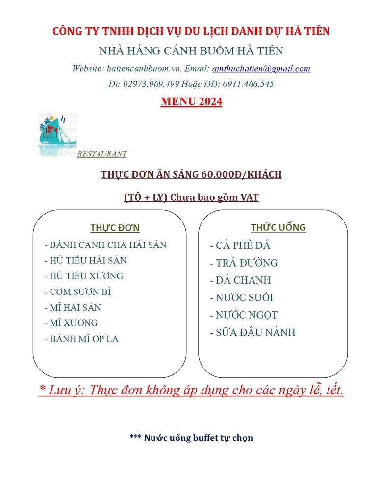 Nhà Hàng Cánh Buồm Hà Tiên chuyên phục vụ: ăn sáng, cơm phần khách đoàn, hải sản tươi sống. Với thực đơn đa dạng, không gian thoáng mát, ngồi bên nhà hàng có thể nhìn thấy cầu Tô Châu, bến phà Thạnh Thới để đi Phú Quốc, cảnh biển view đẹp,… sẽ giúp Quý khách có được chuyến đi vui vẻ và trải nghiệm thú vị.