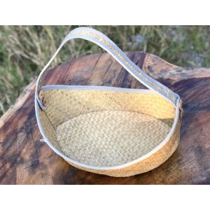 Giỏ quà làm từ bàng tự nhiên 100%, được đan thủ công bởi các nghệ nhân trong vùng. Giỏ có thiết kế độc đáo, giúp ta liên tưởng đến hình chiếc thuyền, giỏ có không gian rộng rải, có thể chứa được rất nhiều quà tặng.