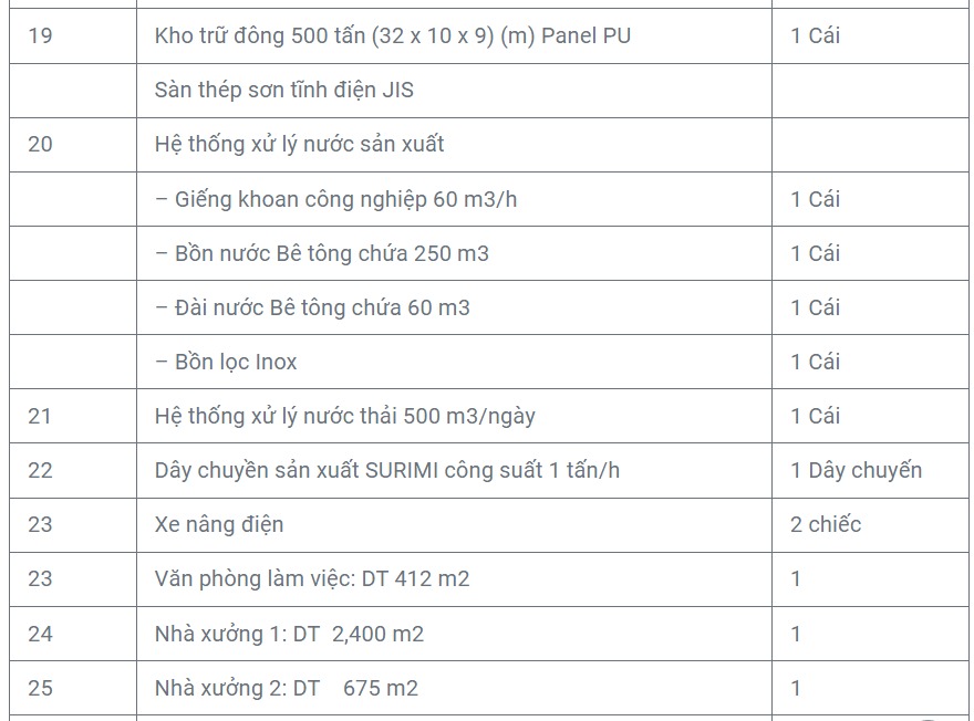 - Nhà máy sản xuất Surimi: 2,400 tấn/năm
