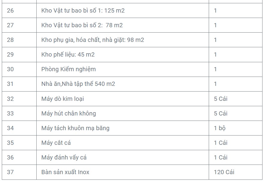 - Nhà máy sản xuất Thủy sản đông lạnh: 1,800 tấn/năm