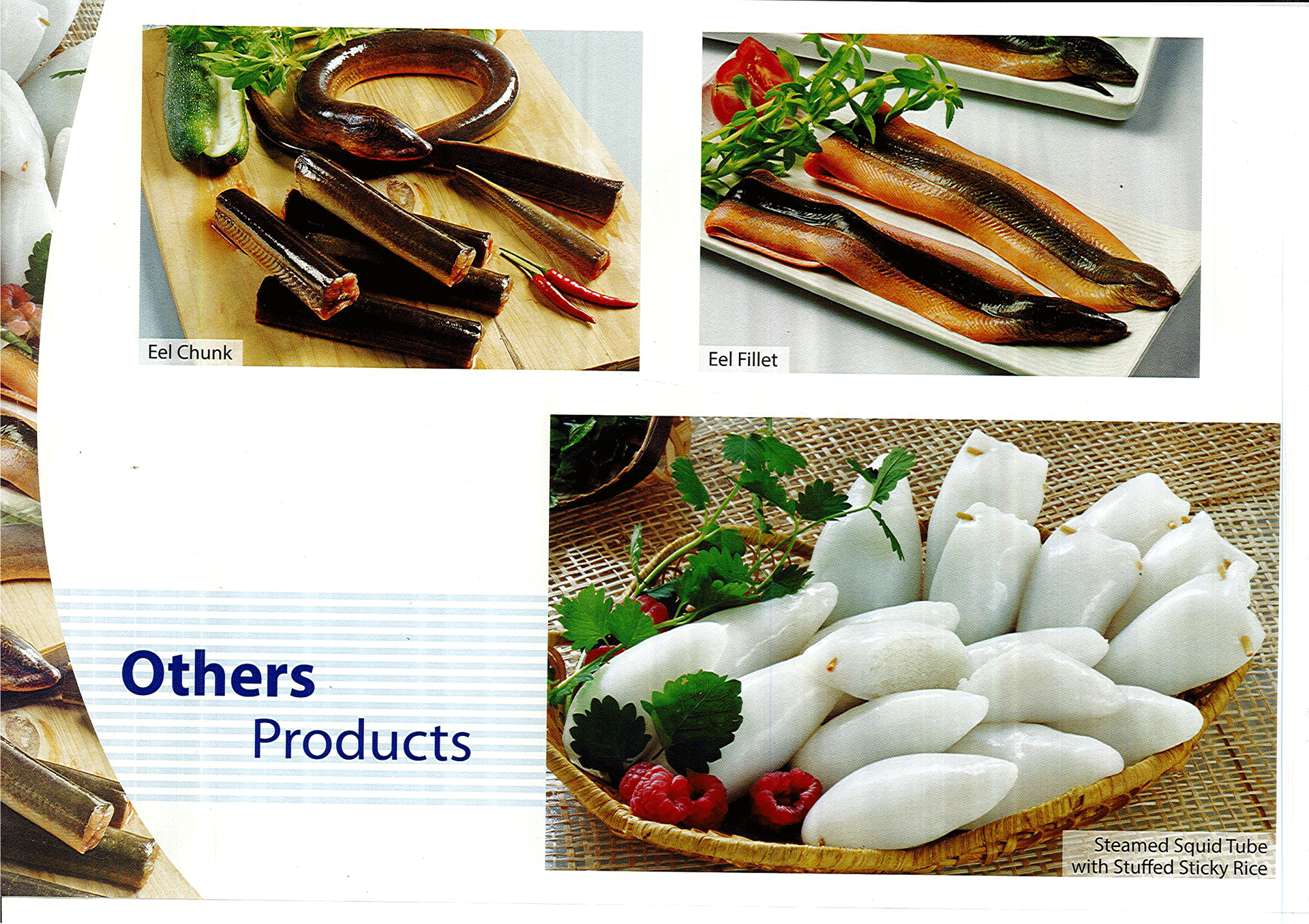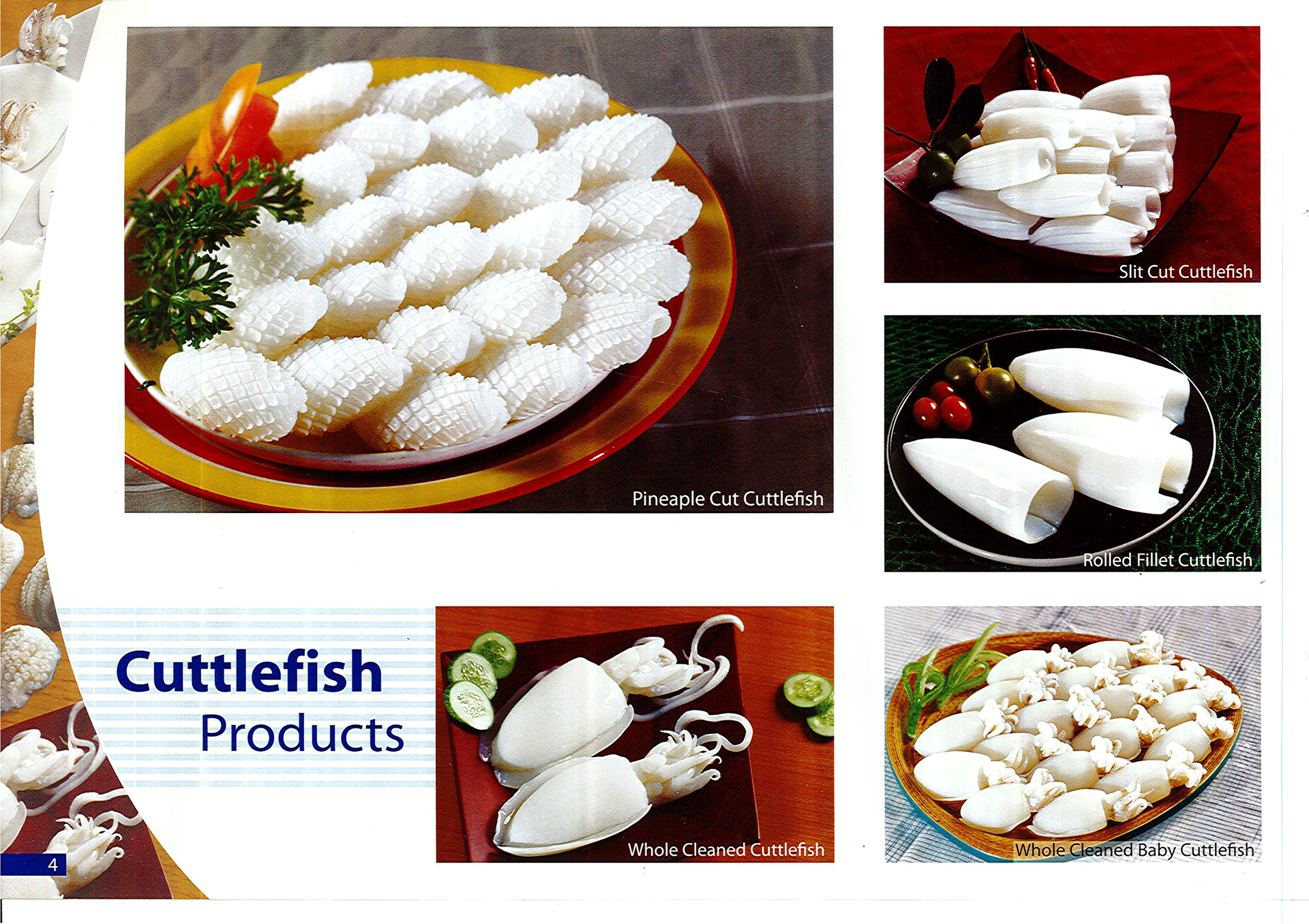 - Mực nang, Mực lá, Mực ống như: Nguyên con, nguyên con làm sạch, fillet, sushi, somen, tube, cắt khoanh, sugata,…