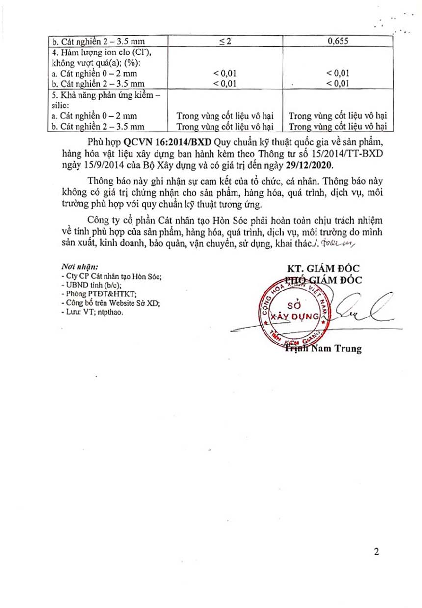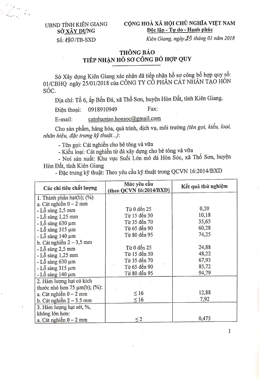 Công ty đã đi vào hoạt động từ tháng 7 năm 2017, sản phẩm gồm có: Cát trộn bê tông và cát vữa xây tô có kích cỡ tương đương với cát tự nhiên trên thị trường. Sản phẩm được quản lý chất lượng theo tiêu chuẩn ISO 9001: 2015; phù hợp với Quy chuẩn quốc gia (QCVN 16:2014/BXD); được Sở xây dựng Kiên Giang công bố hợp quy.