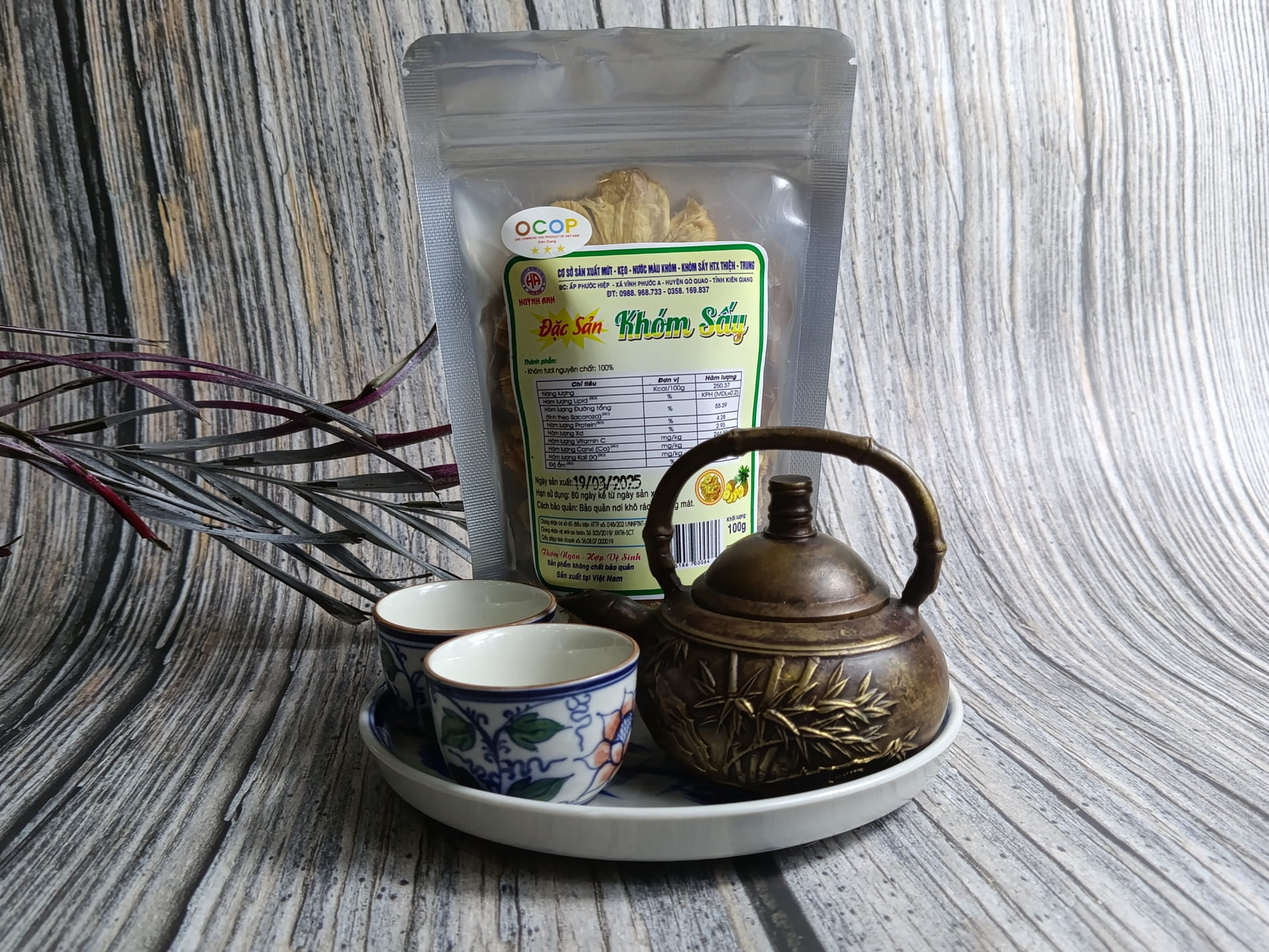 Khóm sấy là sản phẩm được chế biến 100% từ khóm tươi tự nhiên. Đây là món ăn vặt lành mạnh, giàu vitamin và dưỡng chất tốt cho sức khỏe. Vị chua chua, ngọt ngọt đặc trưng của khóm kết hợp với độ dẻo dai vừa phải sau khi sấy sẽ khiến bạn “mê mẩn” ngay từ lần thưởng thức đầu tiên.